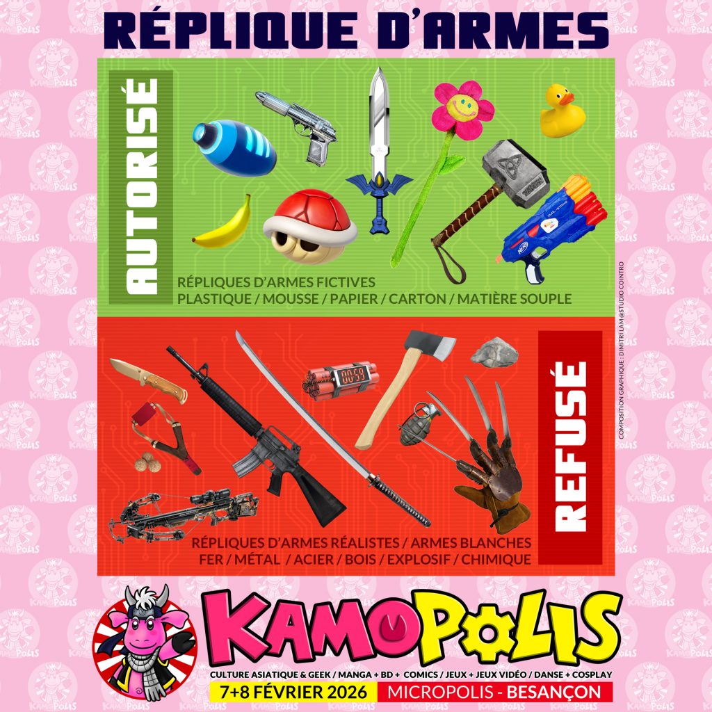 … Les répliques d’armes “réalistes” (type airsoft, armes à feu, ceintures de munitions, grenades, arcs, arbalètes… voir liste plus bas) et les répliques d’armes blanches (types épées, katanas, shuriken… Voir liste plus bas) seront interdites à l’entrée du salon KAMO POLIS.